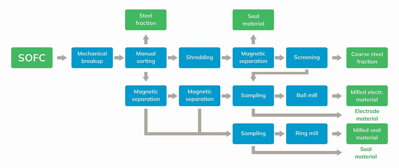 The results are promising. Published in the peer reviewed journal Minerals Engineering in October 2025 under the title ‘Mechanical pretreatment of waste solid oxide cell stacks’, the study shows that mechanical pretreatment can recover more than 90 percent of electrode material in a form suitable for further processing without the use of harmful chemicals.